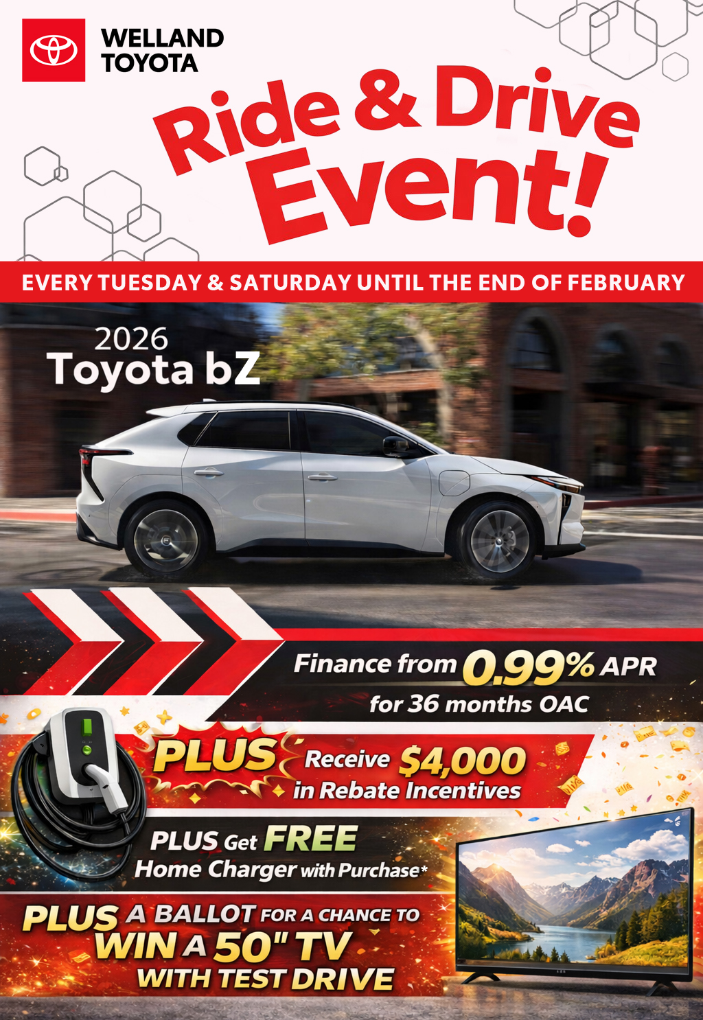 Ready to experience the future of driving? Join us at Welland Toyota for our Ride & Drive Event and get behind the wheel of the all-electric 2026 Toyota bZ. Take it for a spin, explore exclusive incentives, and enjoy event-only perks—plus a chance to win a 50" TV just for test driving. Spots are limited, so RSVP today!